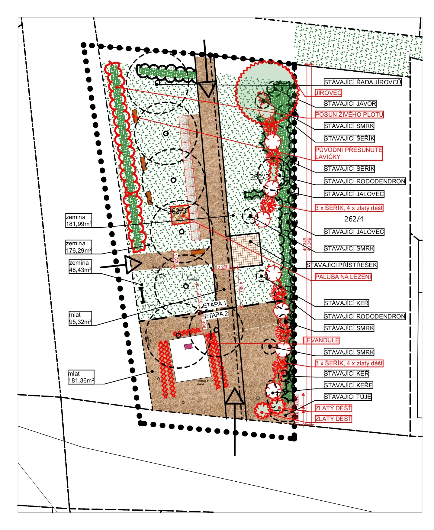 Dojde k částečné obměně stávající zeleně, zachování hodnotných dřevin a doplnění nové výsadby, zejména šeříků, zlatého deště a levandule, které přispějí k estetickému i funkčnímu oživení lokality. Součástí návrhu je také úprava kompozice zeleně, posun živého plotu, doplnění pobytových prvků (např. lavičky a odpočinková paluba) a nové řešení povrchů (mlatové plochy a úprava terénu).