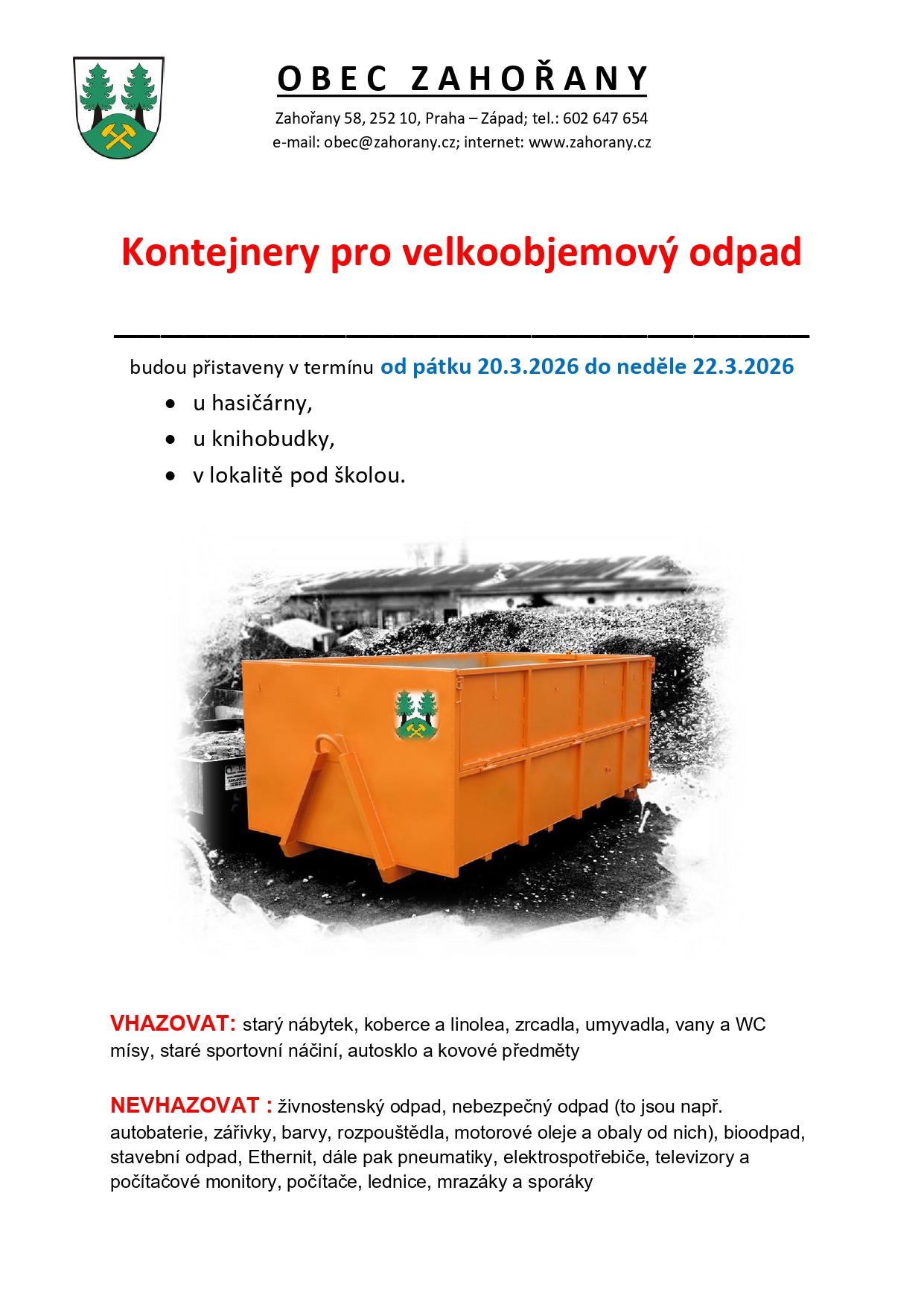 Od pátku 10. 11. 2023 do neděle 12. 11. 2023 budou v naší obci přistaveny kontejnery na velkoobjemový odpad.