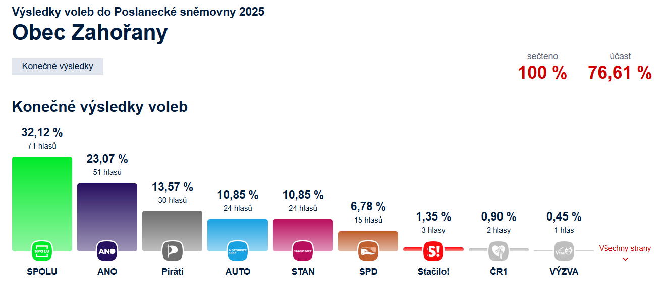 Starosta obce Zahořany podle § 15 zákona č. 247/1995 Sb., o volbách do Parlamentu České republiky a o změně a doplnění některých dalších zákonů, ve znění pozdějších předpisů (dále jen „zákon o volbách do Parlamentu ČR“) oznamuje, že Volby do Poslanecké sněmovny Parlamentu České republiky se konají ve dnech 3.–4. 10. 2025.